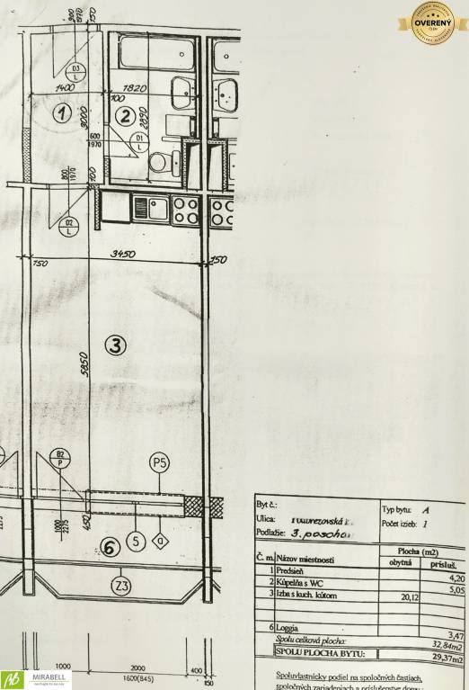 Celková výmera bytu je 29,37 m2 + loggia o výmere 3,47 m2. Byt je v pôvodnom stave kolaudovaný v roku 2001 ako i samotný bytový dom.