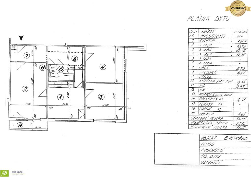 Výmera bytu je 81,81 m2. K bytu prislúcha aj zasklený balkón o výmere 3,31 m2.